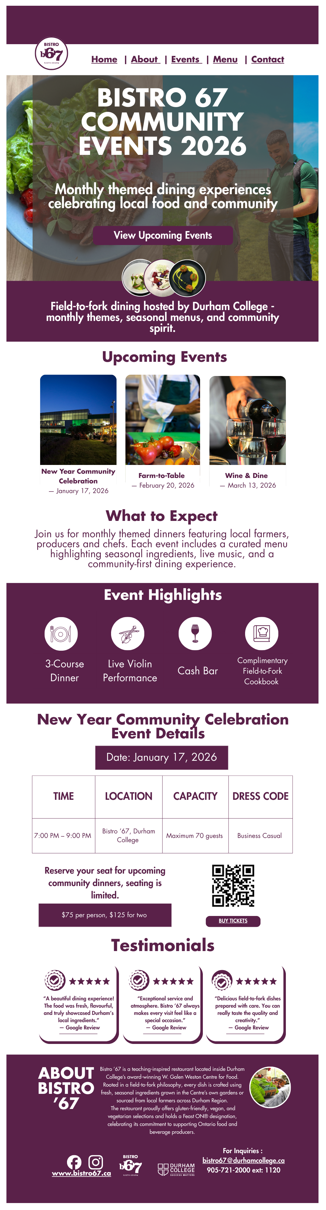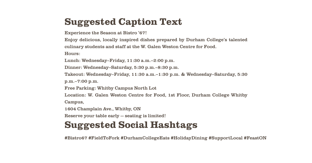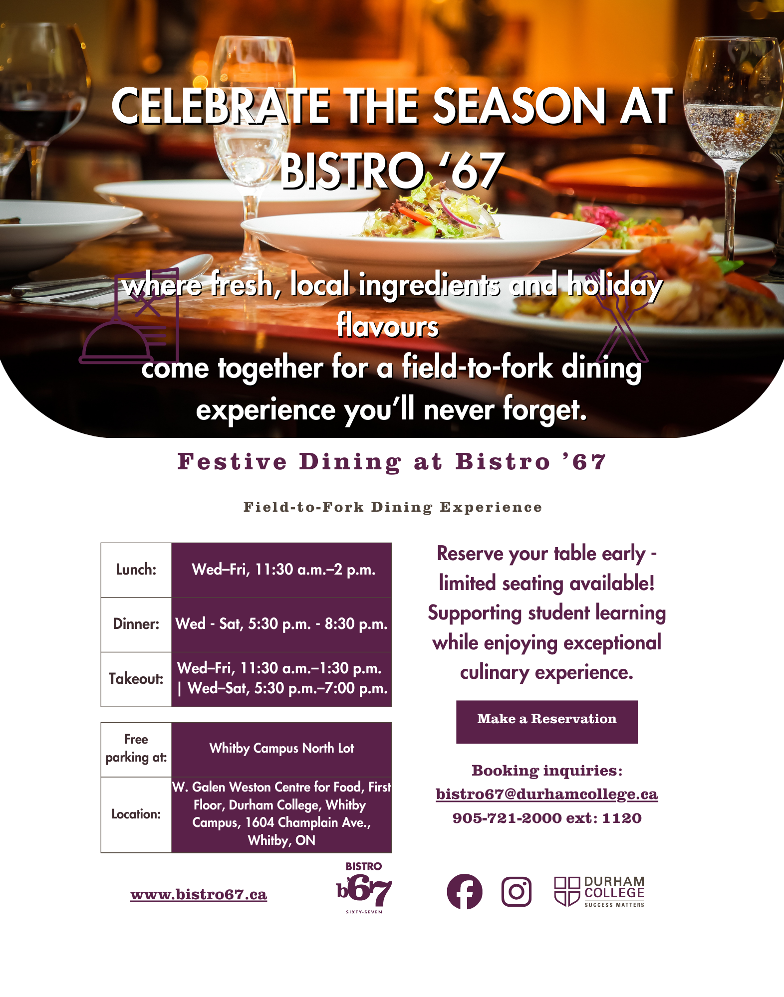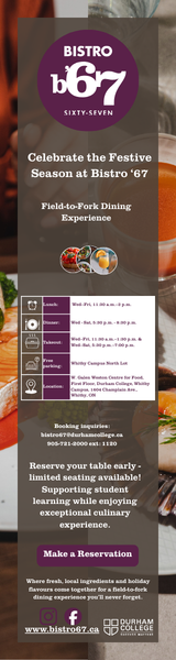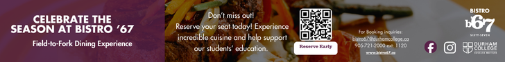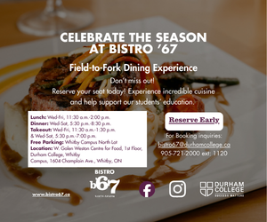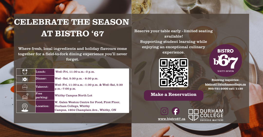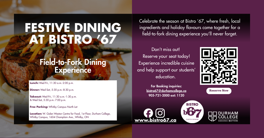 Field-to-fork dining hosted by Durham College - monthly themes, seasonal menus, and community spirit.