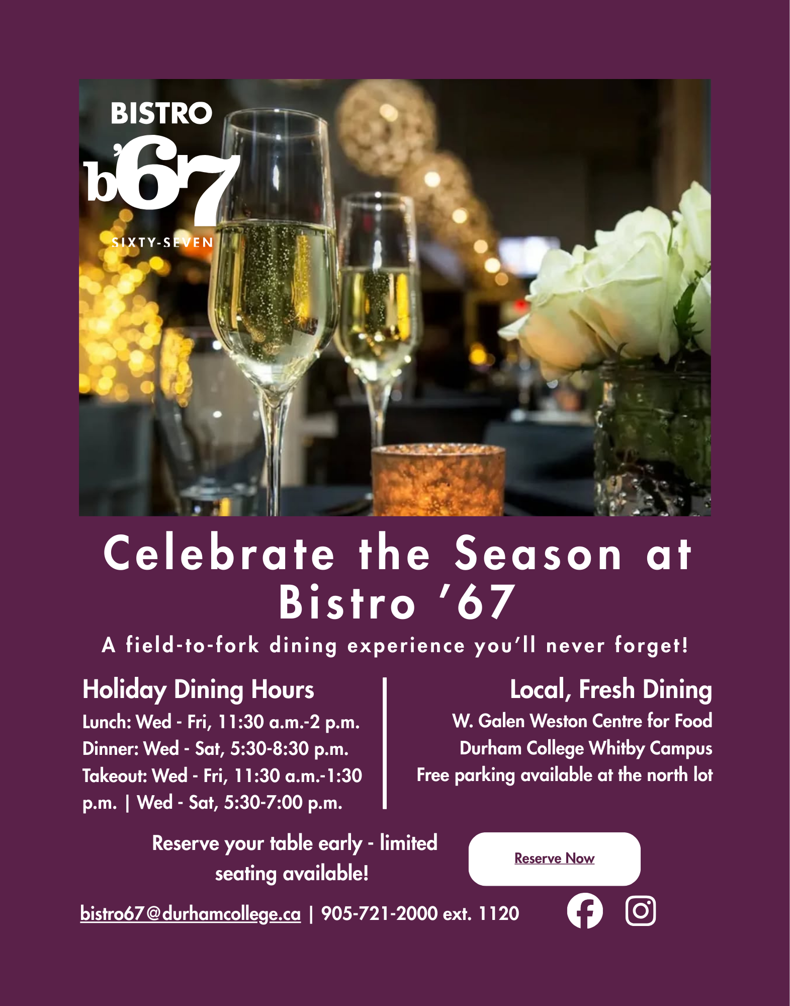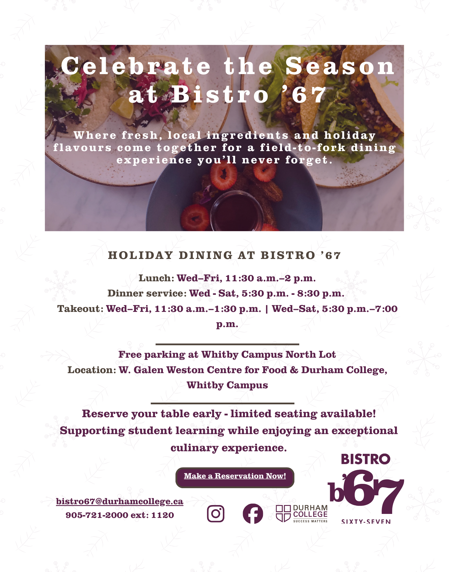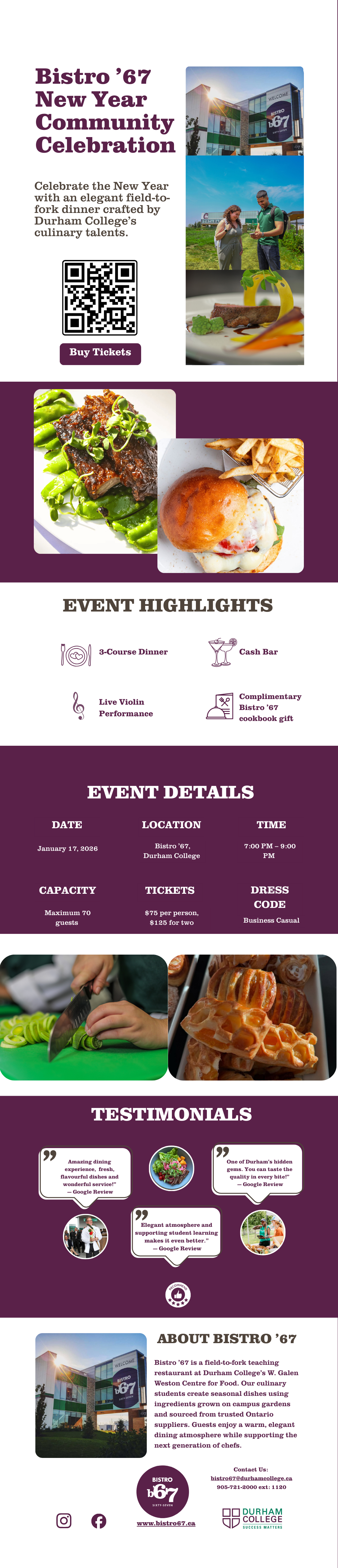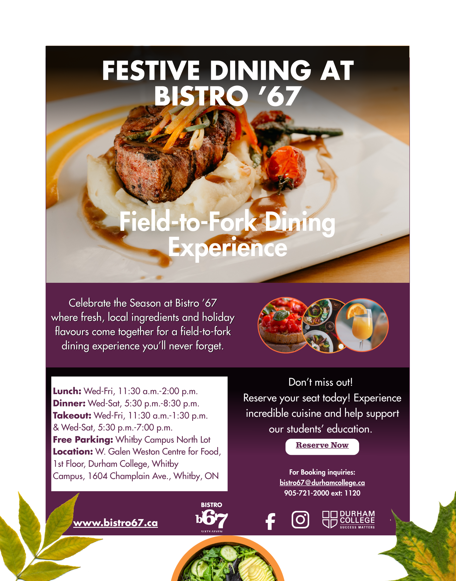 Field-to-fork dining hosted by Durham College - monthly themes, seasonal menus, and community spirit.