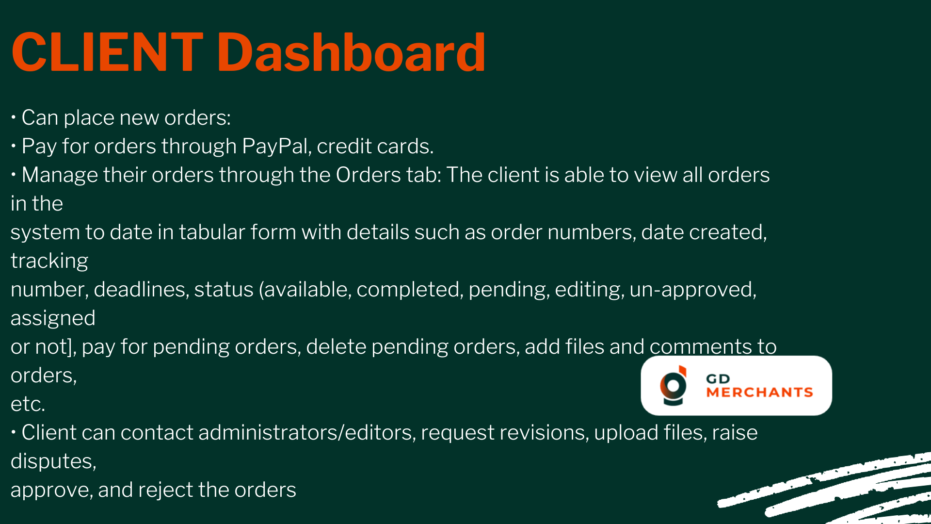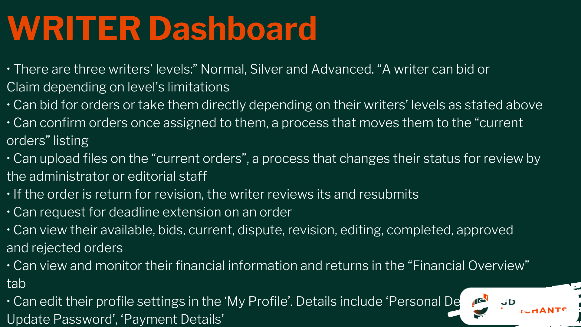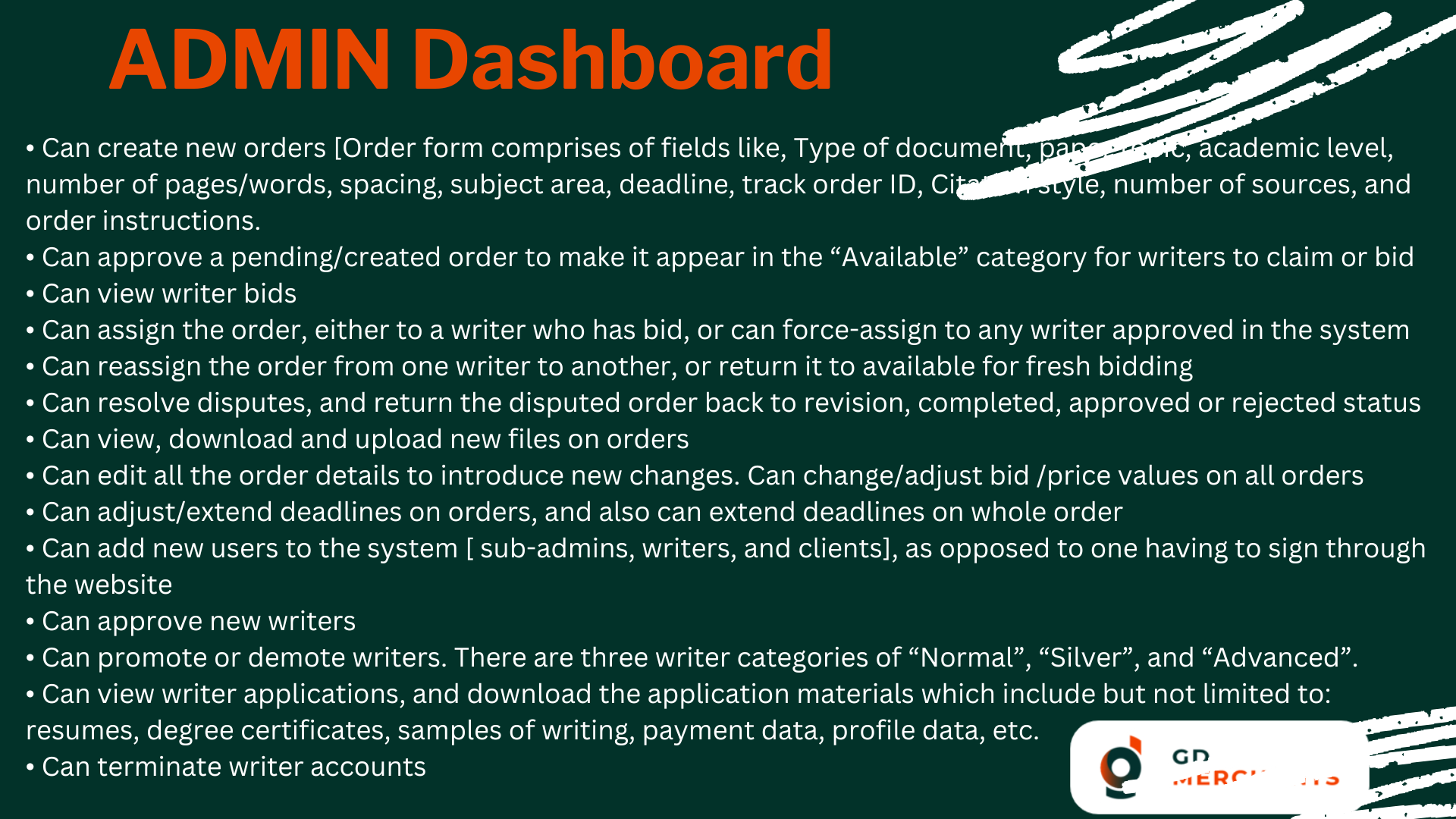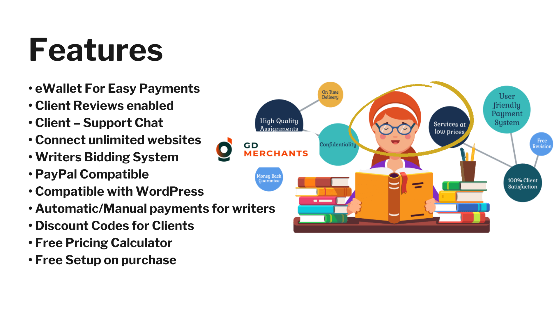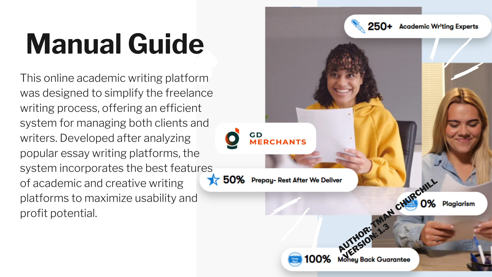 This academic writing marketplace is designed to provide freelance writers with a user-friendly platform that emphasizes great user experience, mobile compatibility, and fast-loading pages. The system manages multiple user roles, including administrators, writers, editors, and clients, while offering seamless order management, integration with various CMS platforms, and secure payment options via PayPal.